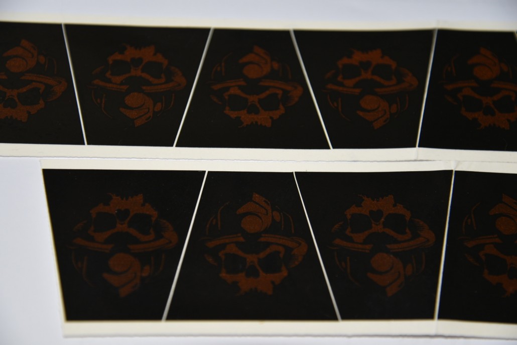 Black Helmet Skull logo printed in Red/Silver/Gold on Black 3M Scotchlite Reflective Material.